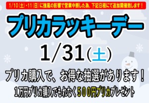 1/10(土).11(日).12(月)にプリカラッキーデーを開催しておりましたが、強風により一時休業した事に伴い、 1/31(土) に追加開催することとなりました。